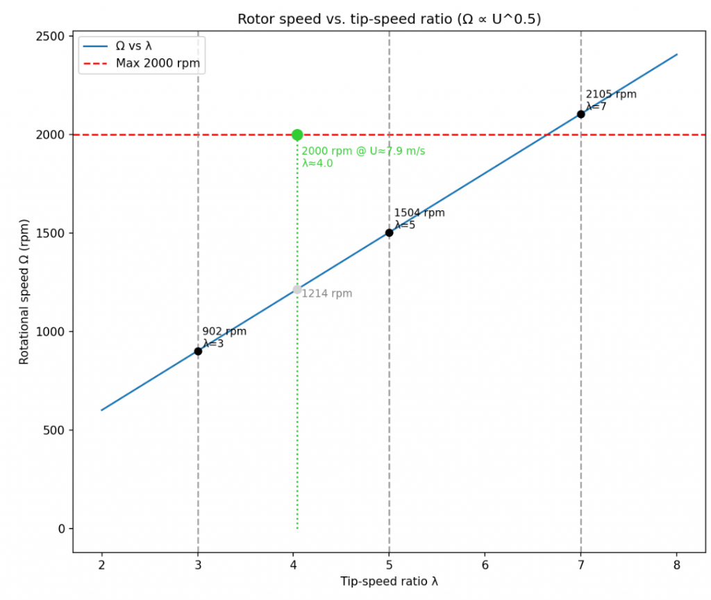 Then, we used a tip speed ratio of 4.5 to set a target angular rotation rate. This helped ensure that our base geometry relationships of the blade were in the efficient zone given the operating conditions from the start. We continued by using the set rotation rate and globally approximated wind velocity to calculate a weighted Reynolds number, as we needed it to evaluate airfoil performance.