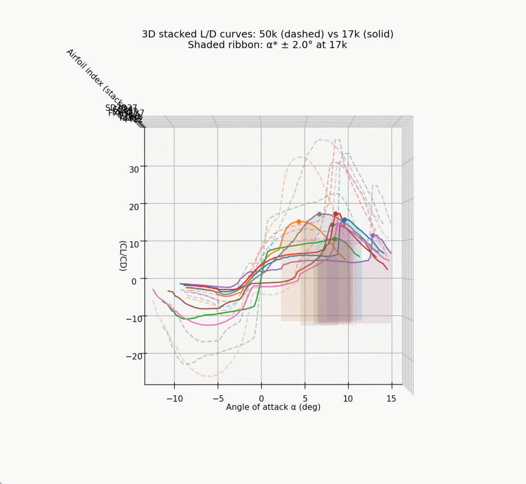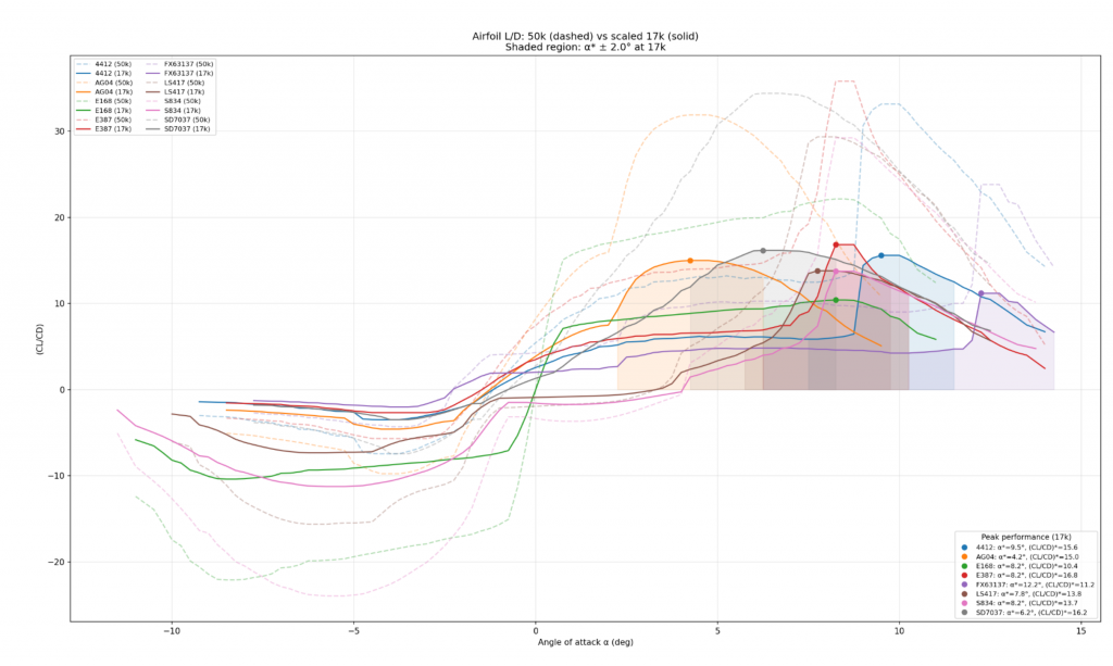 Several low-speed airfoils were selected for comparison. Since the reference data for these airfoils were collected at 50K, and we operate at a much lower Reynolds number, we scaled it down using a power relation to approximate their performance under our conditions.