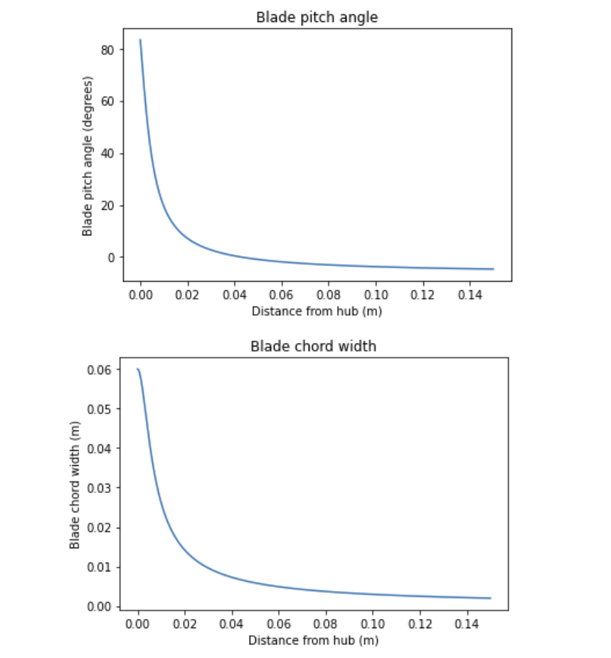Finally, we calculated the integral over the specified window from 1 to 5 degrees. We clearly see SD7037 performs the best. This is our airfoil of choice. Using its performance data, we calculated the chord length and pitch as a function of airfoil radius using two equations from Mathematical methods from Wind Energy Explained (Manwell, McGowan, & Rogers, 2009)