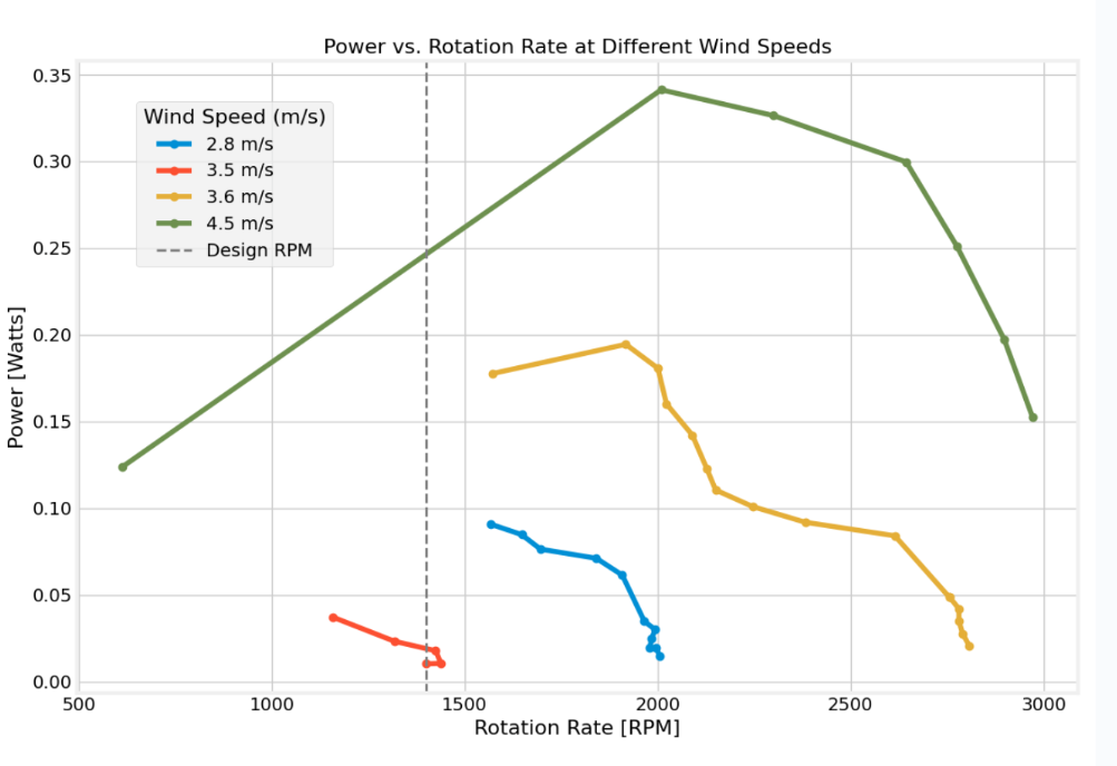 During the experiment, we experienced large static friction, such that the rotor does not rotate until the wind speed exceeded the design point. When the rotation rate jumped as the static friction was overcame, the turbine operated at much higher speed than we anticipated. Near the design point of , we noticed increasing vibrations and concluded that it was near the resonance, and thus stopping the test.