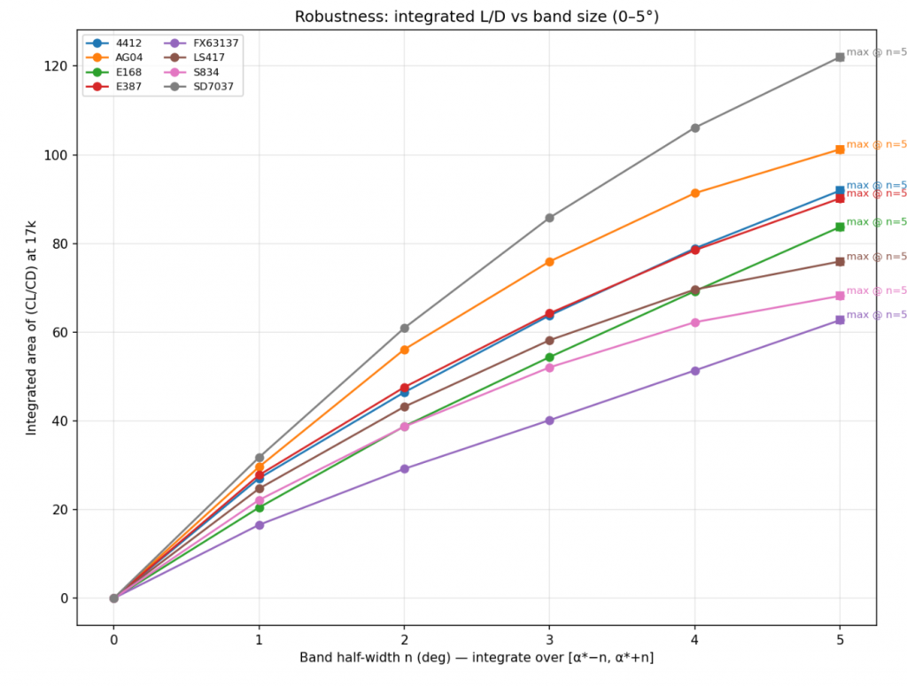 For each airfoil, we generated a scaled performance line as a function of angle of attack. We then found the peak of the performance curve and integrated it over a window that accounts for deviations from optimal performance in real-life conditions.